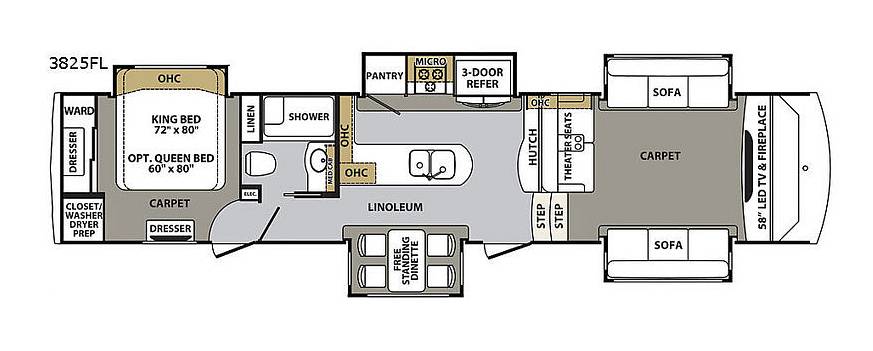 Inside, the Cardinal 3825FL boasts a well-appointed interior that can comfortably sleep up to six people. The living area is thoughtfully designed with plush seating and a cozy atmosphere, perfect for unwinding after a day of adventure. The kitchen is equipped with modern appliances and ample counter space, allowing you to prepare meals with ease. The dining area provides a welcoming space for family meals or gatherings with friends. The master bedroom offers a serene retreat with a comfortable bed and plenty of storage, ensuring a restful night's sleep.