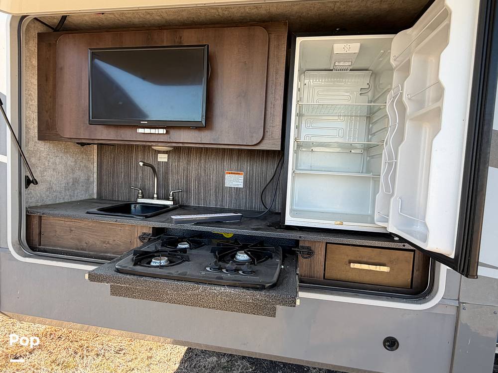 Inside, you'll find a thoughtfully designed interior that maximizes both functionality and comfort. The living area is equipped with plush seating, perfect for relaxing after a day of exploration. The kitchen features modern appliances, including a refrigerator, stove, and microwave, ensuring you can prepare meals with ease. The dining area provides a cozy spot for enjoying meals together. The sleeping arrangements include a master bedroom, bunk beds, and convertible sleeping spaces, ensuring everyone has a comfortable place to rest.