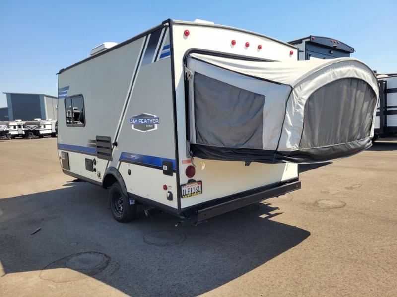 The Jay Feather 17Z is designed with practicality and comfort in mind. Inside, you'll find a thoughtfully laid-out interior that maximizes every square meter. The trailer features a fully-equipped kitchenette with a two-burner stove, microwave, and a refrigerator, ensuring you have everything you need to prepare meals on the go. The dining area comfortably seats four and can be converted into an additional sleeping space, complementing the two queen-sized beds located at each end of the trailer. The bathroom includes a shower and toilet, providing the convenience of home wherever your travels take you.