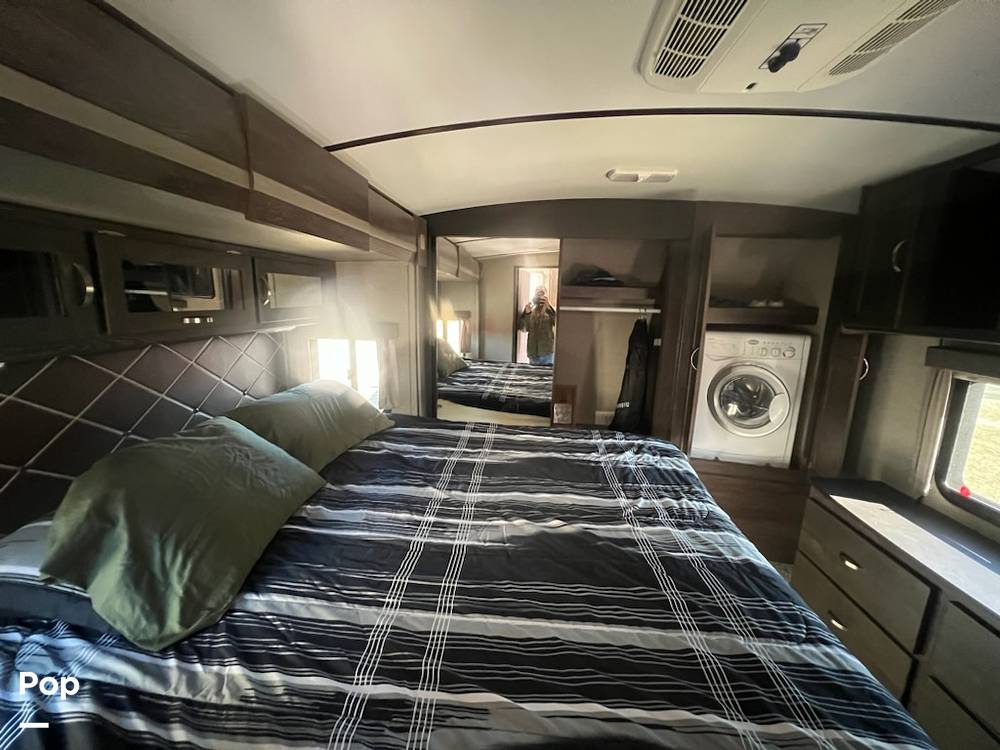 Step inside to find a thoughtfully designed interior that maximizes space and functionality. The living area features plush seating arrangements, perfect for relaxing after a day of exploration. The kitchen is fully equipped with modern appliances, including a refrigerator, microwave, and stove, making meal preparation a breeze. Enjoy your meals at the spacious dinette, which also converts into an additional sleeping area. The master bedroom offers a cozy queen-sized bed, ensuring a restful night's sleep, while the convertible sofa and dinette provide extra sleeping options for guests.