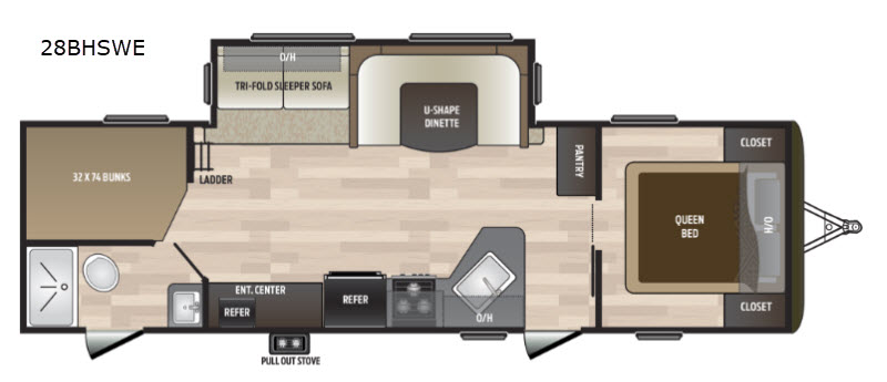 Measuring an impressive 27 feet in length, the Hideout 28BHSWE is expertly crafted to accommodate up to 10 sleepers, making it ideal for family vacations or group getaways. The intelligently designed interior features a cozy master bedroom, double bunk beds, and convertible seating areas, ensuring everyone has a comfortable place to rest. The well-appointed kitchen comes equipped with modern appliances, allowing you to prepare delicious meals on the go, while the inviting living area is perfect for relaxing after a day of exploration.
