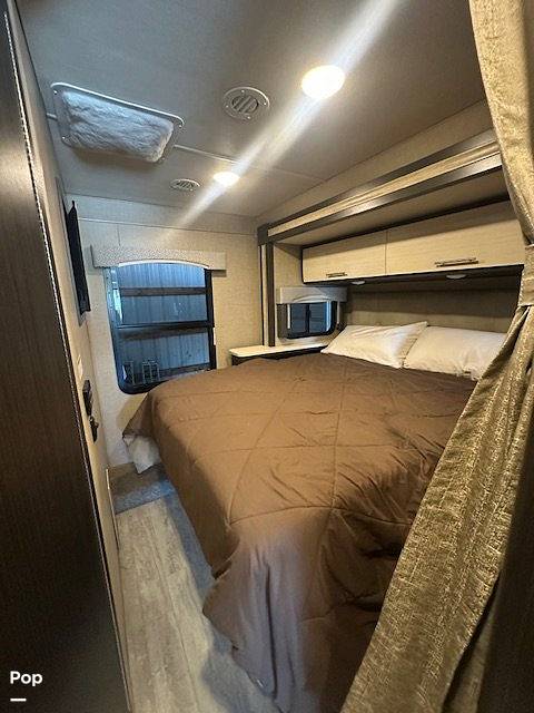Inside, the Thor Motor Coach Vegas 27.7 boasts a thoughtfully designed interior that maximizes space and comfort. The sleeping arrangements are versatile, featuring a queen-sized bed, a convertible sofa bed, a dinette that transforms into a sleeping area, and a drop-down overhead bunk. This ensures that everyone has a cozy place to rest after a day of adventure. The kitchen is equipped with modern appliances, including a refrigerator, microwave, and stovetop, allowing you to prepare meals with ease. The bathroom is spacious and well-appointed, featuring a shower, sink, and toilet, providing all the comforts of home on the road.