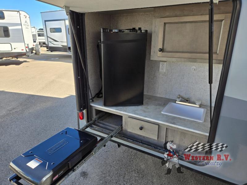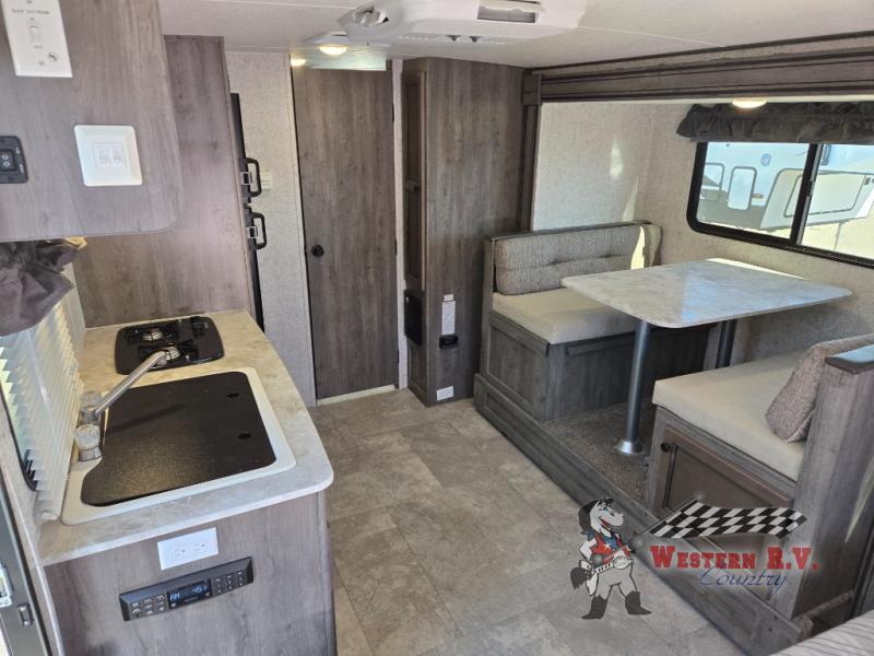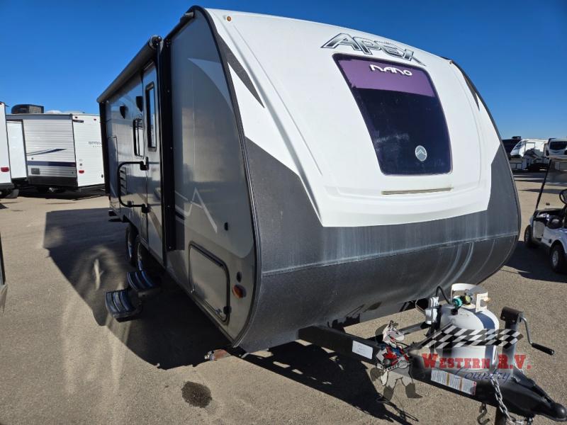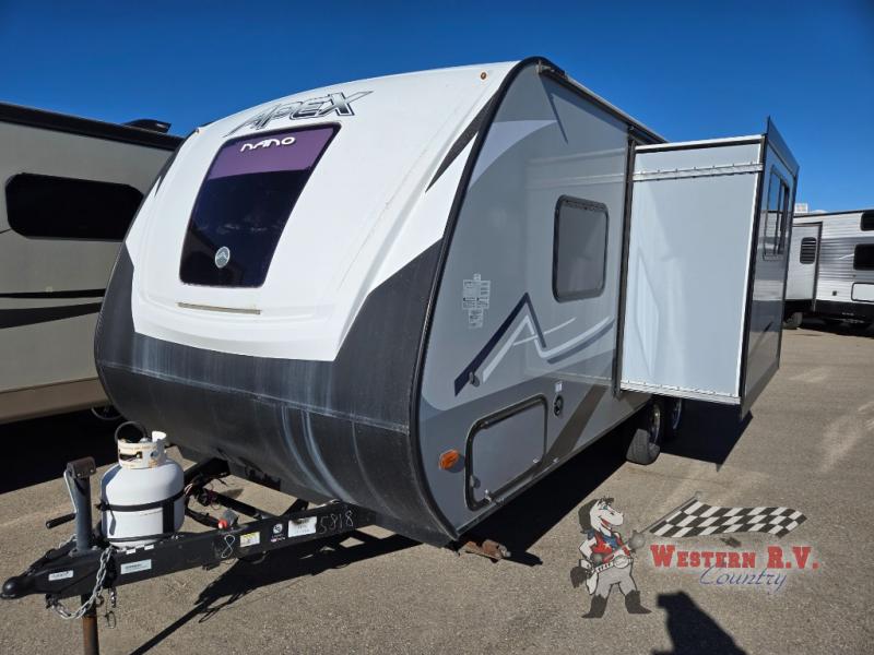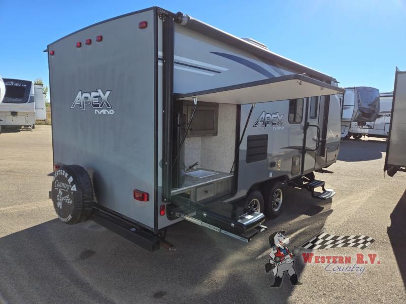 The Apex Nano 203 RBK Hybrid features a thoughtfully designed interior that maximizes space and functionality. The living area is equipped with a cozy dinette, which easily converts into an additional sleeping space, complementing the comfortable queen-sized bed. The kitchen is fully equipped with a refrigerator, microwave, and a two-burner stove, ensuring you have everything you need to prepare meals on the go. The bathroom includes a shower, sink, and toilet, providing the convenience of home wherever your journey takes you.