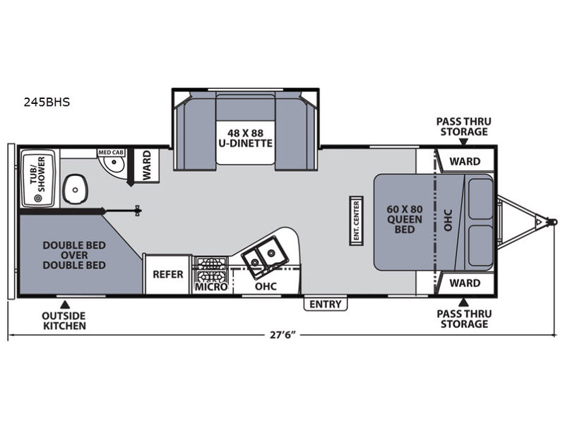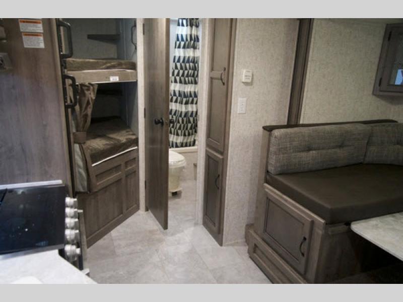 Inside, you'll find a thoughtfully laid-out floor plan that maximizes space and functionality. The Apex 245 BHS features a cozy sleeping arrangement with a queen-sized bed and a bunkhouse, comfortably accommodating up to eight people. The well-appointed kitchen includes a refrigerator, microwave, and a three-burner stove, all designed to make meal preparation a breeze. The dinette and sofa provide ample seating for dining and relaxation, while the full bathroom, complete with a shower, ensures convenience on the road. With a total weight of approximately 2,500 kilograms, this RV is built with lightweight materials that enhance fuel efficiency without sacrificing strength or stability.