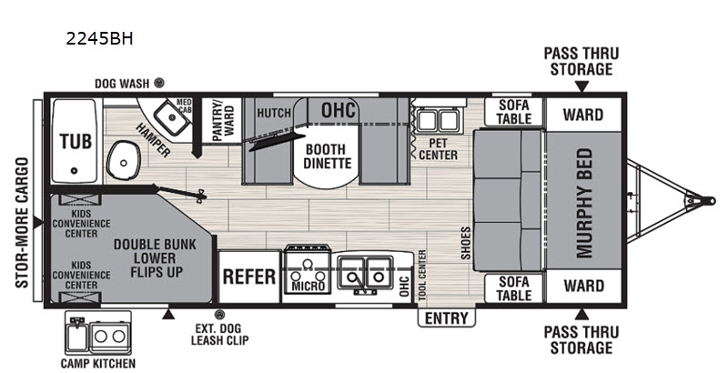 Inside, you'll find a smart layout that can comfortably sleep up to 8 people. Whether you're planning a family getaway or a trip with friends, there's plenty of room for everyone. The cozy sleeping arrangements include a queen bed, bunk beds, and convertible dinette and sofa beds, ensuring a good night's sleep after a day of adventure. The interior is thoughtfully designed with modern amenities and ample storage, so you can bring along all your essentials without feeling cramped.