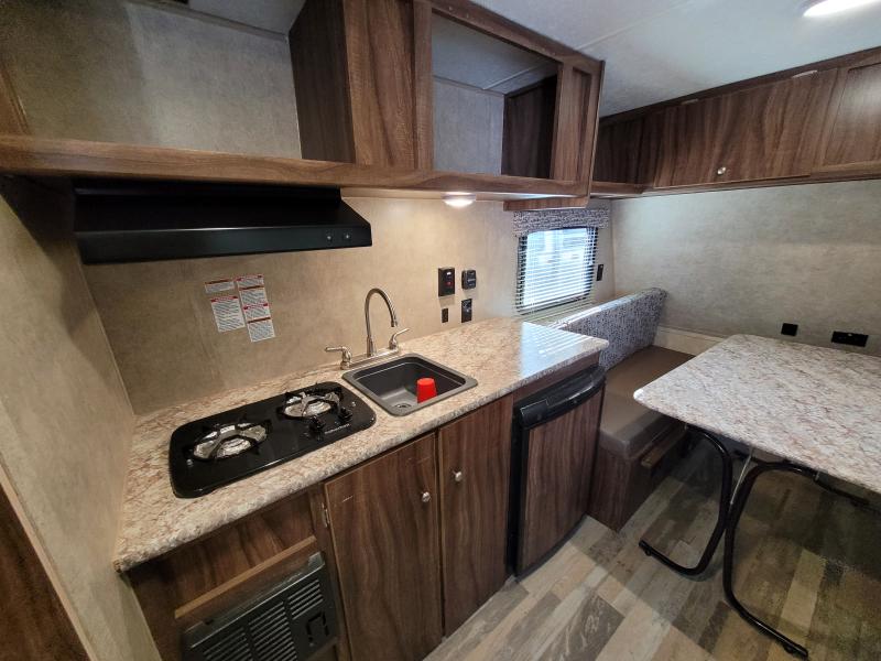 Step inside to find a thoughtfully designed interior that maximizes space and functionality. The VIKING 14SR features a cozy sleeping area, a fully equipped kitchenette with a two-burner stove, and a compact refrigerator, ensuring you have everything you need to prepare delicious meals on the go. The dinette area comfortably seats four and easily converts into an additional sleeping space, making it perfect for small families or couples. With ample storage options throughout, you can bring along all your essentials without feeling cramped.