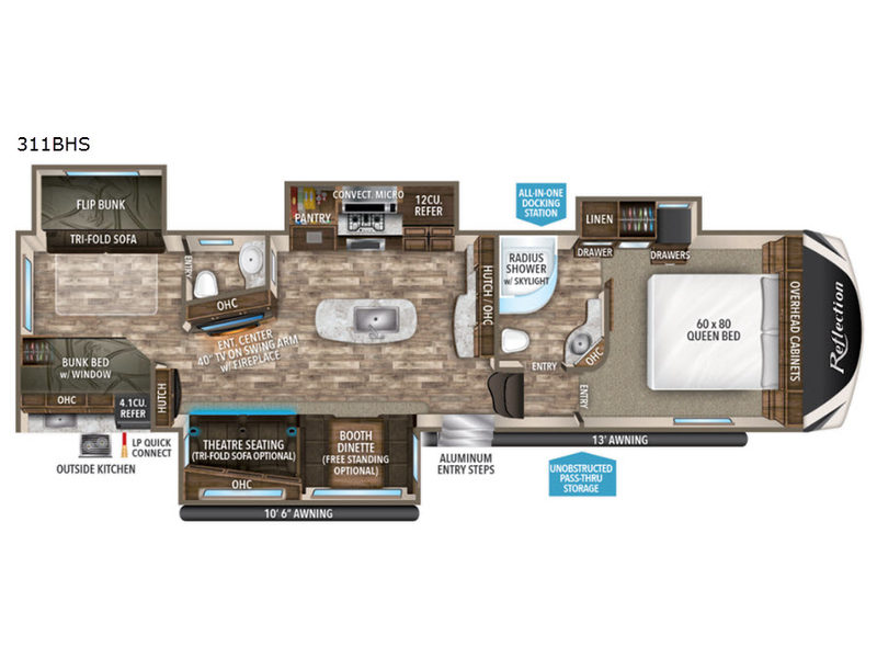 The Reflection 311BHS boasts a private master bedroom with a queen-sized bed, ensuring a restful night's sleep. The bunkhouse is a dream for kids or guests, offering additional sleeping space with its own half bath. With a total of 1.5 bathrooms, morning routines are hassle-free. Outside, enjoy the convenience of an outdoor kitchen and awning, perfect for BBQs and enjoying the great outdoors. This RV is built for adventure, combining comfort with practicality. Don’t miss out on the opportunity to own this fantastic fifth wheel and start making unforgettable memories today!