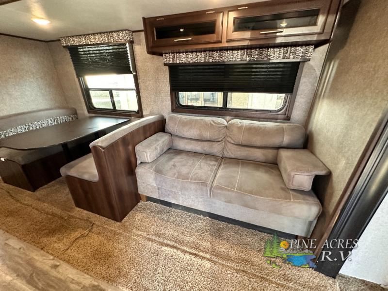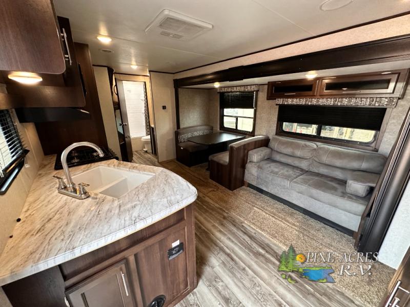 Step inside to find a well-thought-out interior featuring a single slide-out that expands your living space, making it perfect for family gatherings or entertaining friends. The corner bunk beds are a fantastic feature for families, offering a cozy and private sleeping area for the kids. The master bedroom provides a comfortable retreat for adults, ensuring everyone has their own space to relax. The kitchen is equipped with modern appliances, allowing you to prepare meals with ease, while the dinette and sofa offer plenty of seating for dining and lounging.