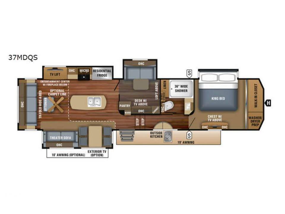 Introducing the 2019 Jayco Pinnacle 37MDQS Fifth Wheel, a luxurious and spacious mobile retreat designed for those who seek both comfort and adventure. This meticulously crafted RV offers an exceptional blend of style and functionality, making it the perfect choice for families and groups who wish to explore the great outdoors without compromising on the comforts of home. With a length of 34 feet, this fifth wheel provides ample space for relaxation and entertainment, ensuring that every journey is as enjoyable as the destination.