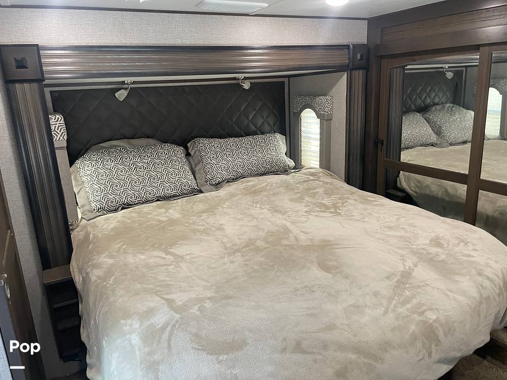 Step inside to find a beautifully appointed living area featuring plush seating and a cozy fireplace, perfect for unwinding after a day of adventure. The kitchen is a chef’s dream, equipped with modern appliances including a full-sized refrigerator, microwave, and oven, all set within elegant cabinetry. The dining area provides a comfortable space for meals and gatherings, making it feel like a home away from home. The master bedroom offers a tranquil retreat with a king-sized bed and generous storage, ensuring you have everything you need for extended trips.