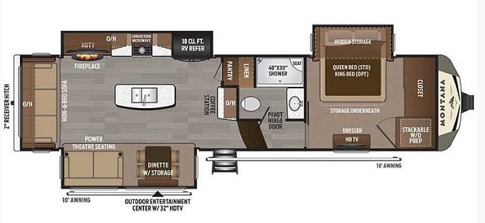 Externally, the Keystone Montana 3120RL is built to withstand the rigors of travel while maintaining an elegant appearance. Its robust construction and high-quality materials ensure durability and longevity. The RV is equipped with ample storage compartments, allowing you to bring along all your essentials and more. Additionally, the Montana 3120RL features advanced climate control systems, ensuring comfort in any weather condition. Whether you are embarking on a cross-country journey or a weekend getaway, this fifth wheel promises an unparalleled blend of luxury, functionality, and style.