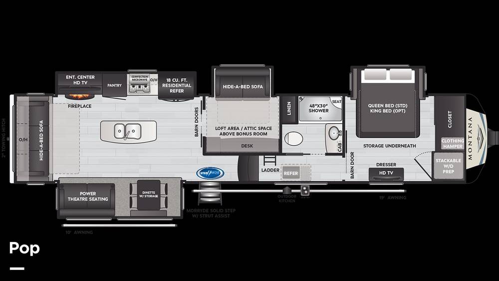 Introducing the 2019 Keystone Montana 3855BR Fifth Wheel, a luxurious and spacious RV designed to elevate your travel experiences. With a length of 34 feet, this fifth wheel offers an exceptional blend of comfort, style, and functionality, making it the perfect choice for families or groups seeking adventure without compromising on the comforts of home. The Montana 3855BR is meticulously crafted to accommodate up to six people, ensuring ample space for everyone to relax and enjoy their journey.