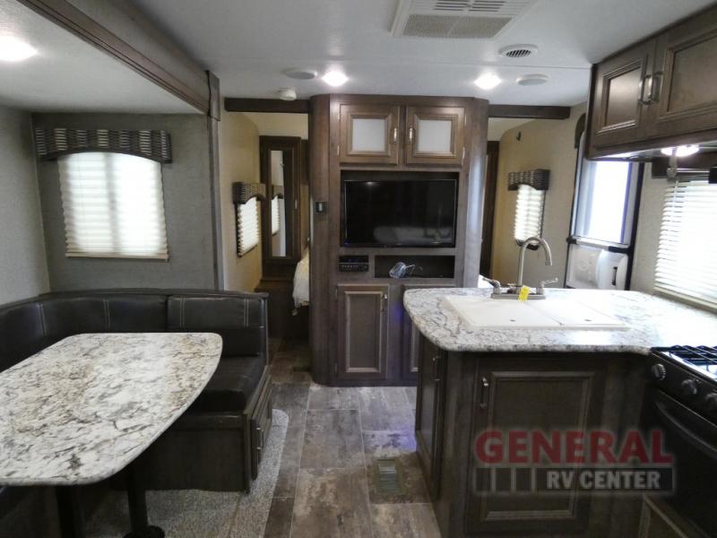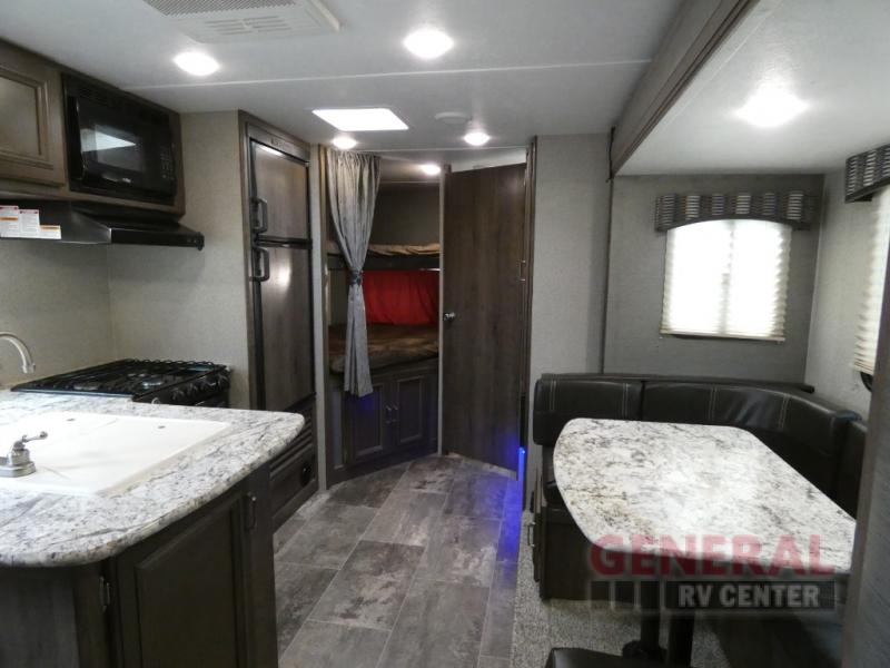 With a spacious interior featuring one slide-out, this travel trailer comfortably sleeps up to eight people, making it perfect for family trips or group getaways. Inside, you'll find a cozy queen bed, double bunk beds, a convertible dinette, and a sofa bed, ensuring everyone has a comfortable place to rest after a day of exploration. The thoughtfully designed kitchen is equipped with modern appliances, allowing you to prepare delicious meals on the go. Plus, the bathroom offers all the essentials, including a shower and toilet, for added convenience.