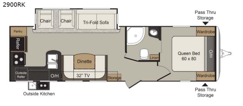 Designed to accommodate up to five individuals, the Passport 2900RK is ideal for families or small groups seeking a memorable travel experience. The intelligently designed floor plan includes a well-appointed rear kitchen, complete with modern appliances and ample storage, making meal preparation a breeze. The living area is thoughtfully arranged to provide a cozy atmosphere, featuring plush seating and a versatile dining area that can easily convert to additional sleeping space.