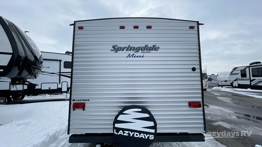 Step inside and be greeted by a thoughtfully designed interior that maximizes space and functionality. The two slide-outs create a roomy atmosphere, allowing for a comfortable living area that can easily accommodate up to four people. Whether you're planning a family getaway or a romantic retreat, the Springdale Mini ensures everyone has a cozy place to rest. The well-equipped kitchen offers all the essentials for preparing delicious meals on the go, while the inviting dining area is perfect for enjoying them together.