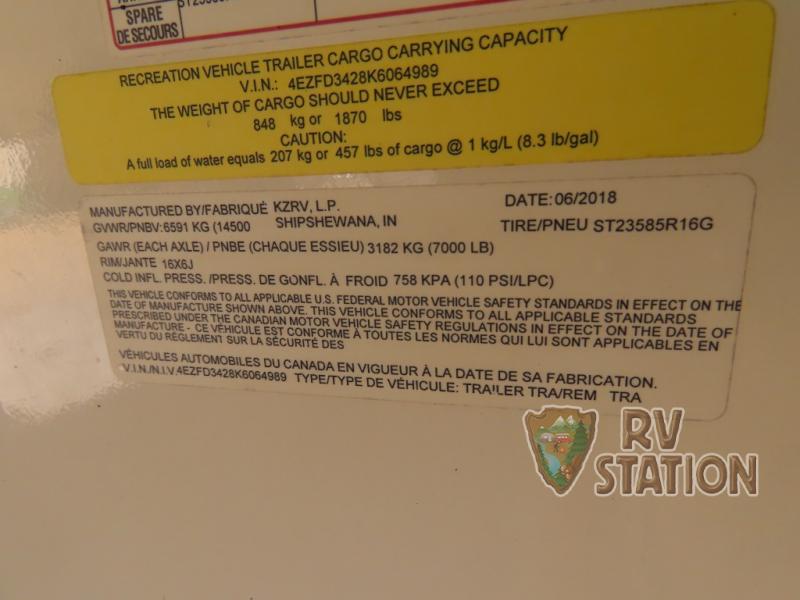 The KZ Durango 347BHF also boasts a well-appointed sleeping area, with a master bedroom that includes a queen-sized bed and ample storage space. The additional bunkhouse provides extra sleeping quarters, making this RV perfect for families or groups. The bathroom is equipped with a full-sized shower and modern fixtures, ensuring all the comforts of home on the road. With its robust construction and luxurious amenities, the 2019 KZ Durango 347BHF Fifth Wheel is not just an RV; it's your gateway to unforgettable adventures. Don't miss the opportunity to own this exceptional vehicle that combines elegance with practicality.