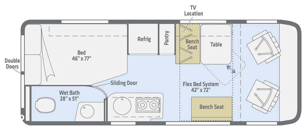 Inside, you'll find a well-thought-out layout that includes a fully equipped kitchen with a refrigerator, microwave, and two-burner stove, allowing you to prepare meals with ease. The sleeping arrangements are cleverly designed to ensure a restful night's sleep, featuring a comfortable double bed and a convertible dinette that transforms into an additional sleeping area. The Travato 59GL also boasts a modern bathroom with a shower, sink, and toilet, providing all the comforts of home while on the road.