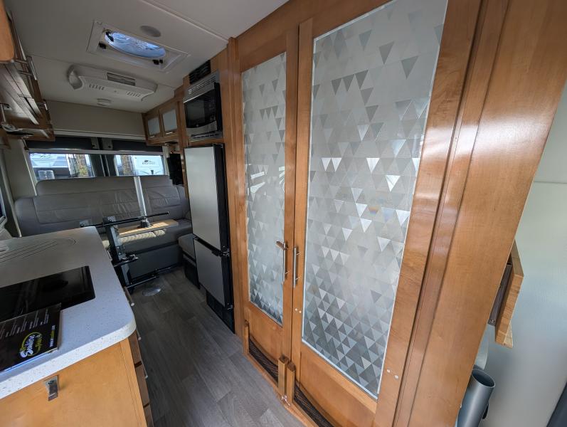 Step inside and you'll be greeted by a beautifully designed interior that maximizes every centimeter of space. The living area features plush seating that easily converts into a comfortable sleeping area, ensuring you get a restful night's sleep. The kitchen is equipped with all the essentials, including a refrigerator, microwave, and a two-burner stove, making meal prep a breeze. With ample storage throughout, you can bring along all your travel essentials without feeling cramped.
