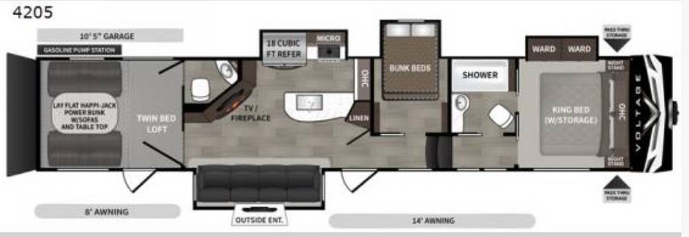 Introducing the 2020 Dutchmen Voltage 4205 Travel Trailer, a pinnacle of luxury and functionality for the discerning traveler. This exceptional RV is designed to accommodate large families or groups, comfortably sleeping up to 11 individuals. With a length of 37 feet, this spacious travel trailer offers ample room for everyone to enjoy their journey in comfort and style.