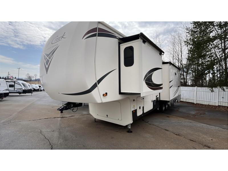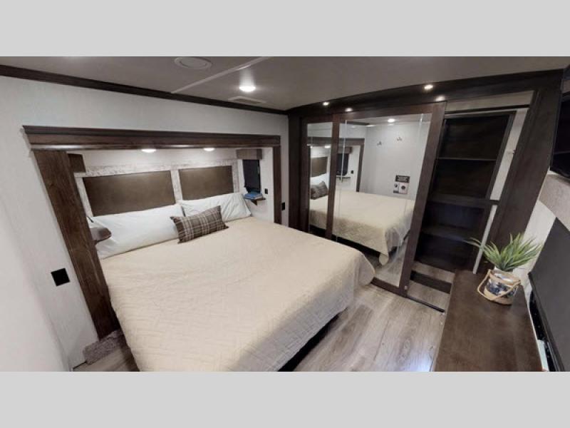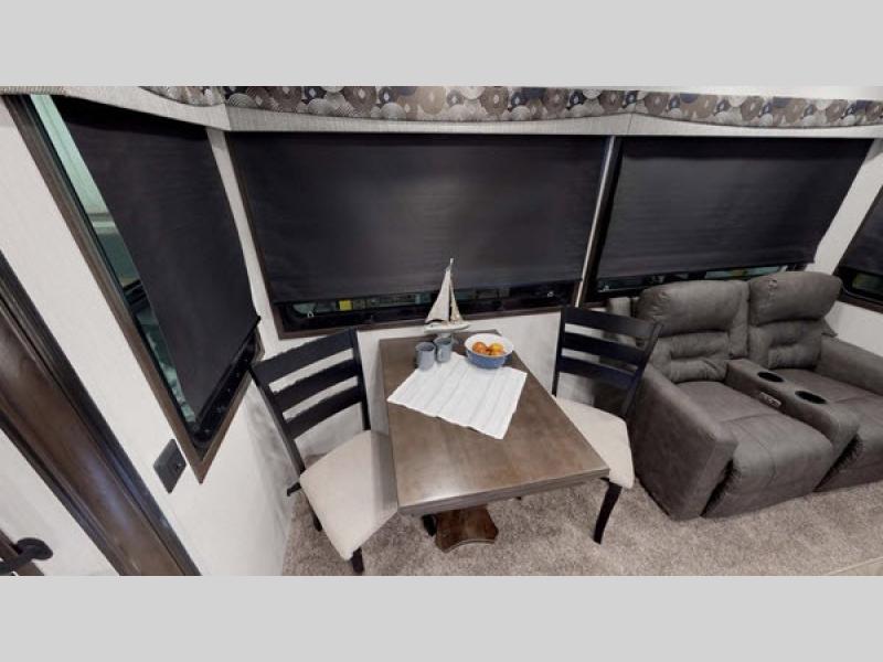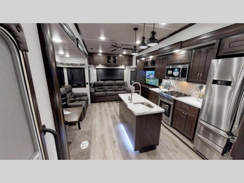 This impressive fifth wheel boasts three slide-outs, providing ample space for relaxation and entertainment. Measuring approximately 29 feet in length, it offers a roomy interior that can comfortably sleep up to four people, making it ideal for families or couples seeking a getaway. The well-appointed living area is perfect for unwinding after a day of adventure, with plenty of seating and a welcoming atmosphere.