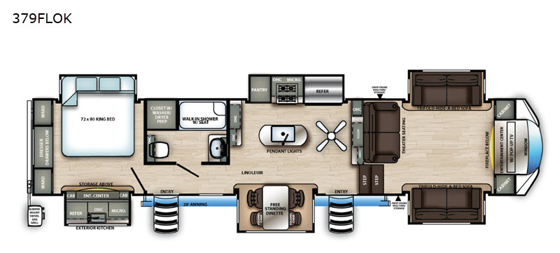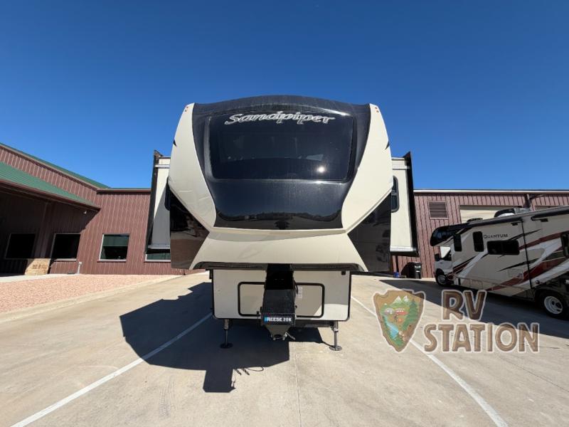 The Sandpiper 379FLOK features six slide-outs, creating a roomy interior that can comfortably sleep up to six people. Whether you're planning a weekend getaway or a cross-country road trip, this RV ensures everyone has their own cozy space to unwind. The thoughtfully designed layout includes a fully equipped kitchen, a welcoming living area, and a stylish bathroom, all crafted to make you feel right at home. Plus, the outdoor kitchen is perfect for those who love to dine al fresco under the stars.