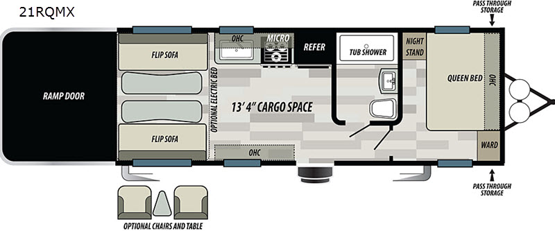 The Shockwave 21RQMX is engineered to accommodate up to four sleepers, making it ideal for family getaways or trips with friends. Its thoughtful design ensures ample space for relaxation and rest after a day of exploration. The RV boasts a substantial fuel capacity of 132 liters, ensuring you have the range to reach your destination and beyond without frequent stops. Weighing in at 3,001 kilograms, this toy hauler is built for stability and durability, providing peace of mind as you traverse diverse terrains.