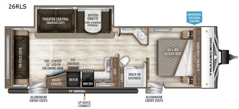 Measuring approximately 27 feet in length, the Transcend 26RLS is thoughtfully designed to maximize space and functionality. Inside, you'll find a cozy living area perfect for unwinding after a day of exploration. The well-equipped kitchen ensures you can whip up your favorite meals with ease, while the comfortable sleeping arrangements guarantee a restful night's sleep for everyone on board. Whether you're lounging in the living area or enjoying a meal at the dinette, this RV provides a welcoming atmosphere that feels just like home.