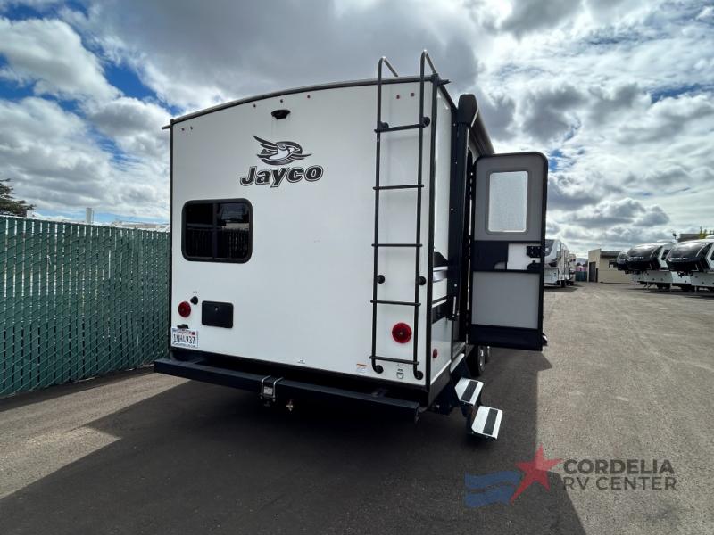 Designed to accommodate up to eight people, the Jay Feather 27BHB ensures that everyone has a cozy place to rest. The intelligently designed floor plan includes a queen-sized bed, double bunk beds, and convertible dinette and sofa beds, offering versatile sleeping arrangements for families or groups of friends. The modern kitchen is equipped with all the essentials, including a refrigerator, microwave, and stovetop, making meal preparation a breeze. The stylish interior, complete with durable finishes and thoughtful storage solutions, ensures that you travel in comfort and style.