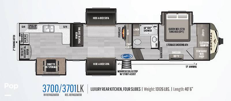 Measuring an impressive 31 feet in length, the Montana 37LK provides ample space for relaxation and entertainment. The thoughtfully designed layout includes a fully equipped kitchen, complete with modern appliances, making meal preparation a breeze. The cozy living area features plush seating and a state-of-the-art entertainment system, perfect for unwinding after a day of adventure. The elegant decor and high-quality finishes throughout the RV create a warm and inviting atmosphere that feels just like home.