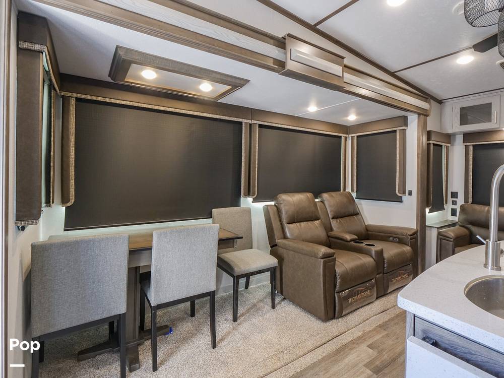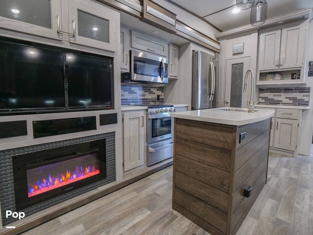 Step inside to find a thoughtfully designed living space featuring high-quality furnishings and finishes. The open-plan layout includes a fully equipped kitchen with a refrigerator, stove, and microwave, ensuring you have everything you need to prepare meals on the go. The cozy living area offers ample seating, a flat-screen TV, and a fireplace, creating a perfect setting for relaxation after a day of exploration. The RV also boasts a separate bunk room, providing additional sleeping space and privacy for guests or children.