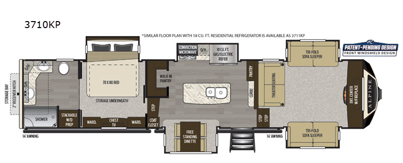 Inside, you'll find all the amenities you need for a comfortable journey. The kitchen is fully equipped for whipping up your favorite meals, and the living area is perfect for relaxing after a day of exploring. With its modern finishes and thoughtful layout, this Keystone Alpine is more than just an RV—it's your home away from home. Ready to hit the road? This Fifth Wheel is your ticket to adventure!