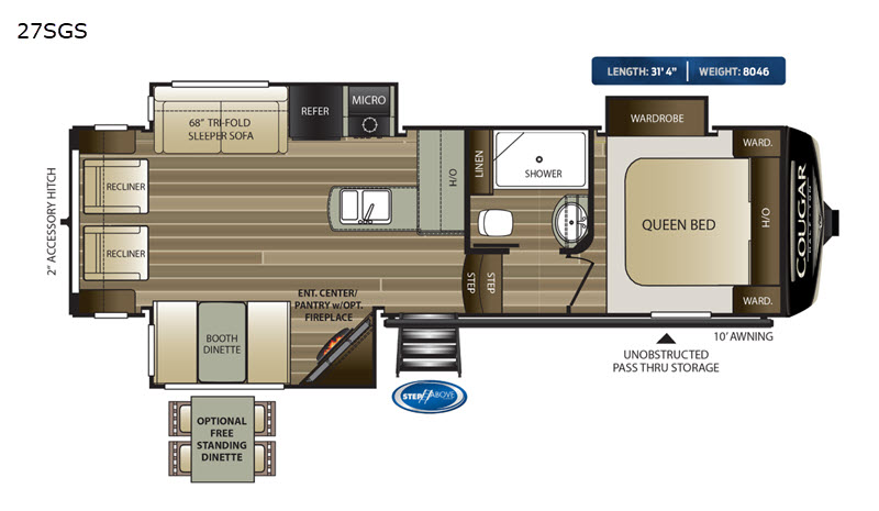 The Cougar 27SGS features three strategically designed slide-outs, expanding the living area to provide an open and inviting atmosphere. Inside, the RV comfortably accommodates up to five guests, making it ideal for family adventures or trips with friends. The interior is thoughtfully appointed with high-quality furnishings and modern amenities, ensuring a comfortable and enjoyable stay. The kitchen is equipped with state-of-the-art appliances, allowing for effortless meal preparation on the road.