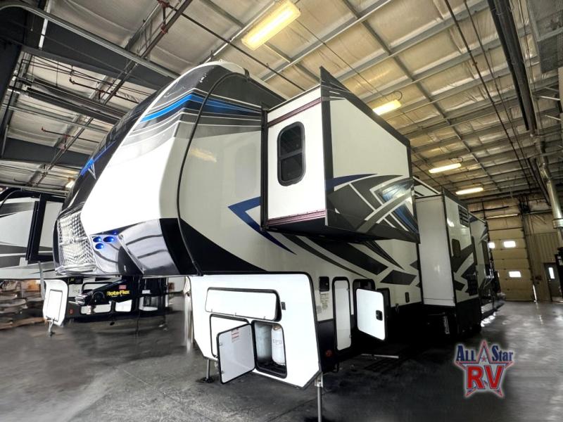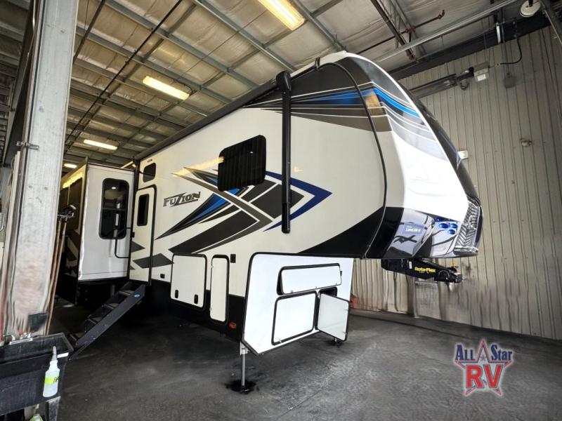 Step inside and be greeted by a modern interior that combines style with practicality. The spacious living area, complete with comfortable seating and a well-equipped kitchen, makes it easy to entertain or relax after a day of adventure. The Fuzion 419 is not just an RV; it's your ticket to freedom and exploration. So, pack your bags, gather your loved ones, and hit the road in style with this exceptional fifth wheel. Your next adventure awaits!