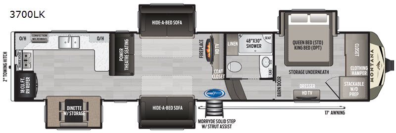 This meticulously crafted RV can comfortably accommodate up to six people, making it ideal for family vacations or group adventures. The Montana 3700LK boasts a thoughtfully designed interior, featuring a fully equipped kitchen, a cozy living area, and a luxurious master suite. The kitchen is a chef's delight, complete with modern appliances and ample counter space, while the living area offers plush seating and entertainment options for relaxation after a day of exploration. The master suite provides a tranquil retreat, ensuring restful nights on the road.