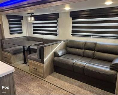 Inside, you'll find a thoughtfully designed interior that maximizes space and functionality. The sleeping arrangements include a queen-sized bed, double bunk beds, and convertible sofa and dinette areas, ensuring everyone has a cozy spot to rest. The modern kitchen is equipped with essential appliances, including a refrigerator, microwave, and stove, allowing you to prepare meals with ease. The bathroom features a spacious shower and all the amenities needed for a comfortable stay.