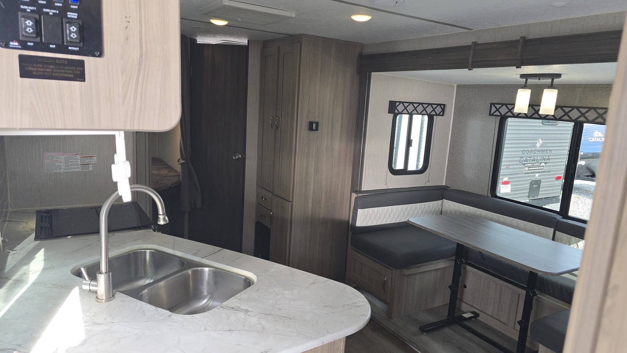 Inside, you’ll find a cozy setup that comfortably sleeps up to five people. Whether it’s a family getaway or a trip with friends, everyone will have their own space to relax and unwind. The well-designed interior features a spacious kitchen with all the essentials, a comfy dinette for meals or game nights, and a bathroom that ensures you don’t have to sacrifice comfort while exploring the great outdoors.