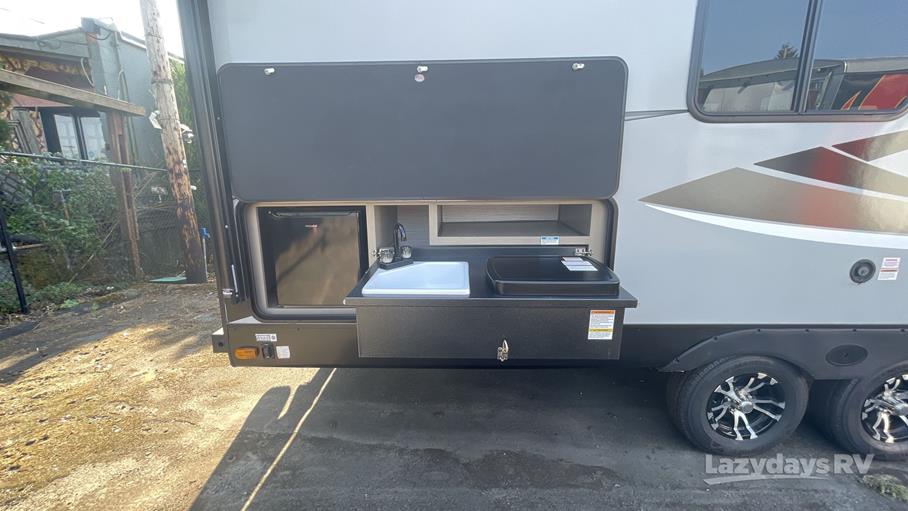 Inside, the Shadow Cruiser boasts a thoughtfully designed interior with a modern aesthetic. The living area is equipped with plush seating and a versatile dining space, providing a cozy environment for relaxation and meals. The kitchen is fully equipped with high-quality appliances, including a refrigerator, microwave, and stove, all designed to make meal preparation a breeze. The trailer also includes a spacious bathroom with a shower, ensuring comfort and convenience during your travels. With a sleeping capacity for up to six people, this travel trailer is perfect for family trips or group adventures.
