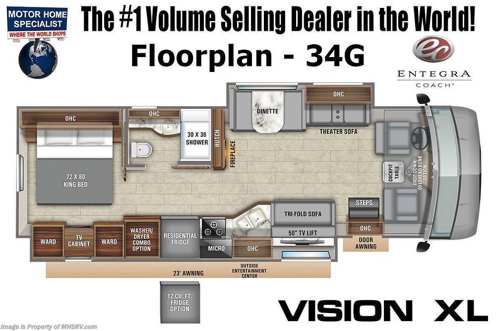 Introducing the 2021 Entegra Vision XL 34G Class A motorhome, a remarkable blend of luxury, comfort, and functionality designed for the discerning traveler. This meticulously crafted RV is perfect for families or groups, offering ample space and amenities to ensure a memorable journey. With the ability to comfortably sleep up to eight people, this motorhome is ideal for both short getaways and extended adventures.
