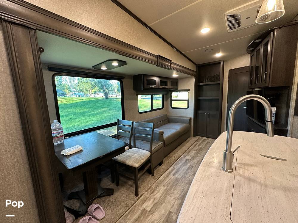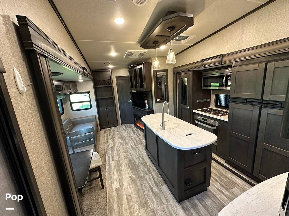 Measuring approximately 31 feet in length, this fifth wheel provides a generous living space without compromising on maneuverability. Inside, you'll find a beautifully appointed interior with modern amenities and thoughtful touches. The kitchen is equipped with top-of-the-line appliances, perfect for preparing meals on the go. The living area is designed for relaxation, featuring comfortable seating and entertainment options to keep everyone entertained during downtime. Plus, the separate bunkhouse offers a private retreat for kids or guests.