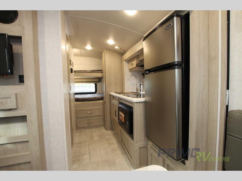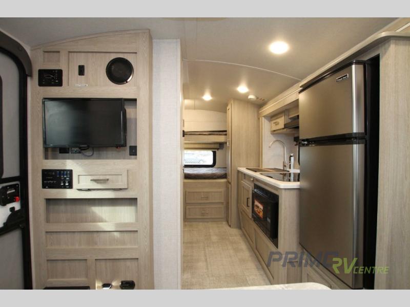The E16BH model features a smart design with one slide-out, maximizing your living space without compromising on mobility. Inside, you'll find accommodations to comfortably sleep up to four people, making it perfect for family getaways or trips with friends. The interior is thoughtfully laid out, offering a cozy sleeping area, a functional kitchenette, and a compact yet efficient bathroom. Every inch of this travel trailer is utilized to provide a comfortable and convenient living experience on the road.