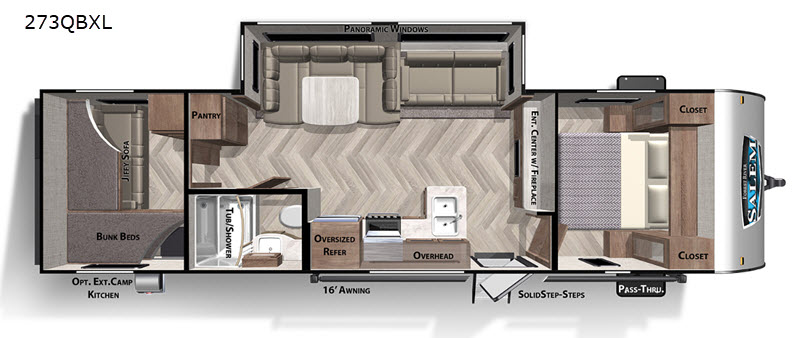 The Salem Cruise Lite 273QBXL features a single slide-out, maximizing interior space to comfortably accommodate up to nine people. Whether you're traveling with family or friends, everyone will have a cozy place to sleep. The well-designed floor plan includes a private master bedroom, a spacious bunkhouse, and convertible sleeping areas in the living space, ensuring everyone has their own corner to relax.