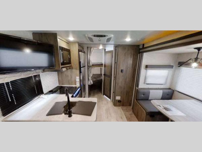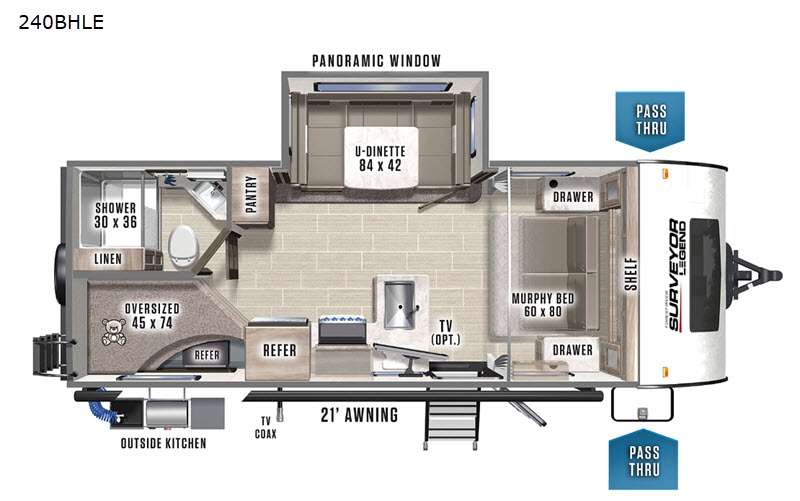 The Surveyor Legend 240BHLE features one slide-out, providing extra living space to ensure comfort during your travels. Inside, you'll find accommodations to sleep up to six people, making it perfect for family vacations or trips with friends. The intelligently designed interior includes a cozy sleeping area, a functional kitchen with modern appliances, and a comfortable dining space, ensuring you have everything you need for a memorable trip.