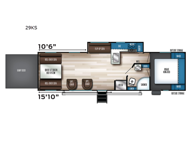 Measuring an impressive 29 feet in length, the Vengeance Rogue 29KS is engineered to accommodate up to six sleepers comfortably, making it ideal for family getaways or trips with friends. The thoughtfully designed interior maximizes space and convenience, featuring modern amenities and high-quality finishes that create a welcoming atmosphere. Whether you're winding down after a day of adventure or hosting a cozy gathering, this RV is equipped to meet all your needs.