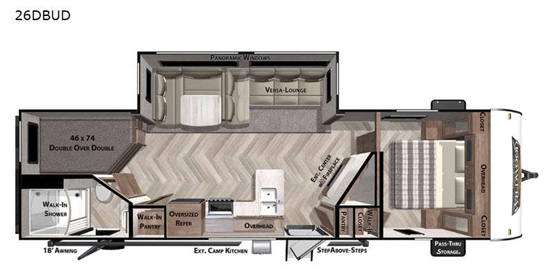 The Wildwood 26DBUD is engineered to accommodate up to 10 sleepers, making it ideal for large families or groups of friends. The cleverly designed interior features one slide-out, which expands the living space, providing a roomy and inviting atmosphere. The layout includes a private master bedroom, double bunk beds, a convertible dinette, and a cozy sofa, ensuring everyone has a comfortable place to rest after a day of adventure.