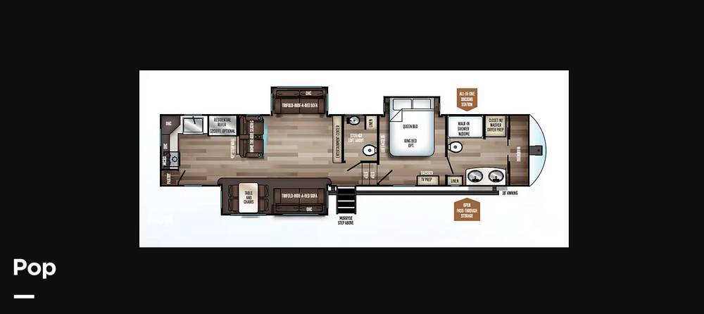 Step inside, and you'll be greeted by a spacious and stylish interior. The living area is perfect for relaxing after a day of adventure, with cozy seating and a large entertainment center. The kitchen is a dream for any home chef, featuring modern appliances and plenty of counter space to whip up your favorite meals. Plus, with a full bathroom and an additional half bath, you'll have all the comforts of home right at your fingertips.