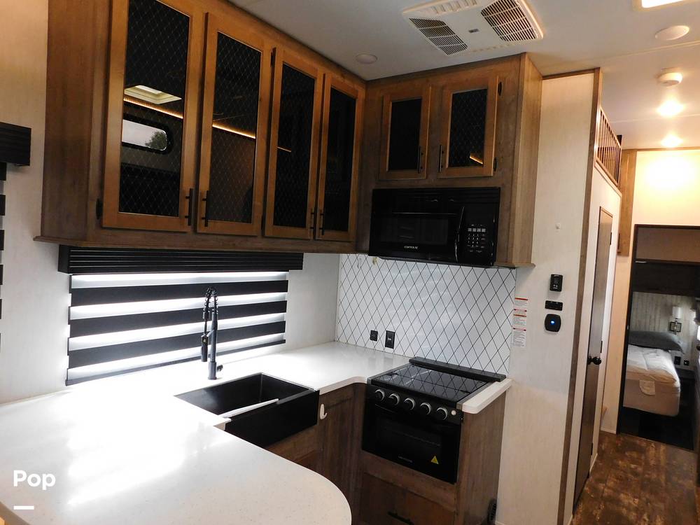 Step inside and be greeted by a beautifully designed interior that combines style with functionality. The Sabre 37FLL boasts a length of 36 feet, providing ample space for everyone to relax and enjoy. The living area features plush seating and a cozy fireplace, creating a warm and inviting atmosphere for those chilly evenings. The kitchen is fully equipped with modern appliances, including a large refrigerator, stove, and microwave, making it easy to whip up your favorite meals on the go.