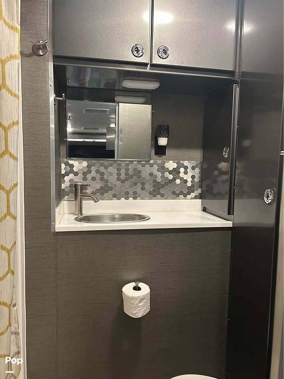 Inside, you'll find a well-appointed living area that combines functionality with style. The modern kitchen is equipped with all the essentials, including a refrigerator, stove, and microwave, making meal preparation a breeze. The cozy sleeping quarters ensure a restful night's sleep, while the convertible seating areas provide flexibility for dining and relaxation. The bathroom features a shower and toilet, offering the convenience of home on the road.