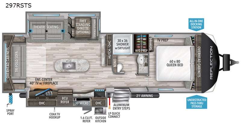 The exterior of the Reflection 297RSTS is equally impressive, featuring a durable, weather-resistant build with an aerodynamic front cap and LED lighting. The large awning provides ample shade, while the pass-through storage offers generous space for all your travel essentials. With its state-of-the-art insulation and climate control systems, this travel trailer is designed to keep you comfortable in any season. Whether you're embarking on a weekend getaway or an extended journey, the 2021 Grand Design Reflection 297RSTS Travel Trailer promises to elevate your travel experience with its exceptional features and superior craftsmanship.