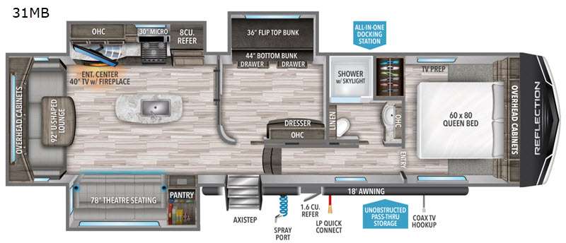 Weighing in at approximately 4,439 kilograms, the Reflection 31MB is engineered for easy towing, ensuring a smooth journey to your favorite destinations. Inside, you'll find a thoughtfully designed layout that maximizes space and functionality. The cozy living area features plush seating and a modern entertainment center, perfect for relaxing after a day of exploration. The fully-equipped kitchen boasts high-quality appliances and ample counter space, making meal preparation a breeze.
