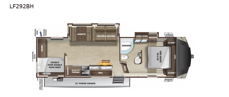 The Open Range Light LF292BH features two strategically designed slide-outs, enhancing the living space and providing a spacious interior that can comfortably accommodate up to seven people. Whether you're embarking on a weekend getaway or an extended road trip, this RV ensures that everyone has a cozy place to rest. The intelligently designed floor plan includes a master bedroom, a bunkhouse, and a convertible dinette, offering versatile sleeping arrangements to suit your needs.
